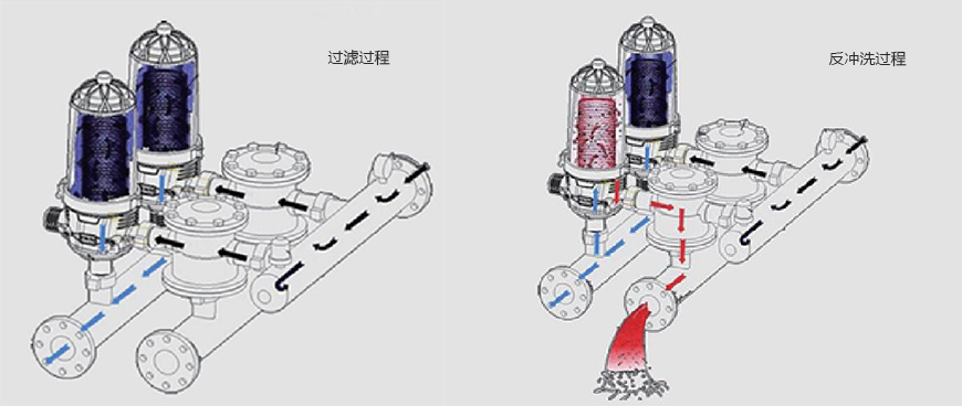 過(guò)濾系統(tǒng)有兩種運(yùn)行狀態(tài):過(guò)濾狀態(tài)和反沖洗狀態(tài)。