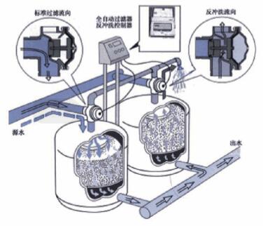 隨著雜質(zhì)在填料層中不斷聚積,內(nèi)部壓頭損失將不斷增大。當(dāng)進(jìn)、出水壓頭損失達(dá)到設(shè)定值時,系統(tǒng)將自動激活定壓裝置使其轉(zhuǎn)換至反洗狀態(tài),當(dāng)此臺反洗結(jié)束,水力閥改變給水方向從而實現(xiàn)逐臺反洗,更便于清洗聚積起來的雜質(zhì)。