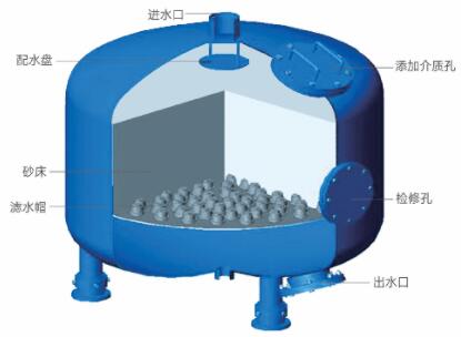 當(dāng)系統(tǒng)處于過濾狀態(tài)時,未經(jīng)過濾的水通過自行研制獨特的布水器均勻布水,水以層流狀態(tài)通過濾器內(nèi)的填料層(精制均粒石英砂/石榴石)。當(dāng)水流過填料層時,雜質(zhì)被截留在填料層內(nèi)。過濾器底部有多個均勻分布的集水器,將過濾后的水均勻地收集并引出,平流過濾,可以使過濾器在高流速下過濾,仍可達(dá)到較好過濾的效果。